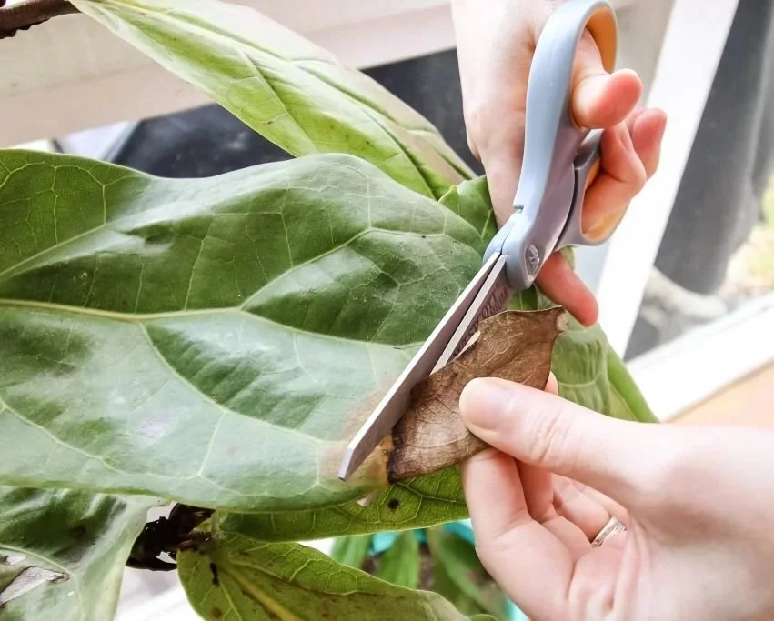 Disinfected pruning shears before pruning is a must! We trim dead or drooping leaves and shape browning tips to blend naturally with the plant. After pruning, we wipe the leaves with a damp microfiber towel to remove dust and debris. For tougher plants, a little neem oil can help the leaves shine and be healthy.