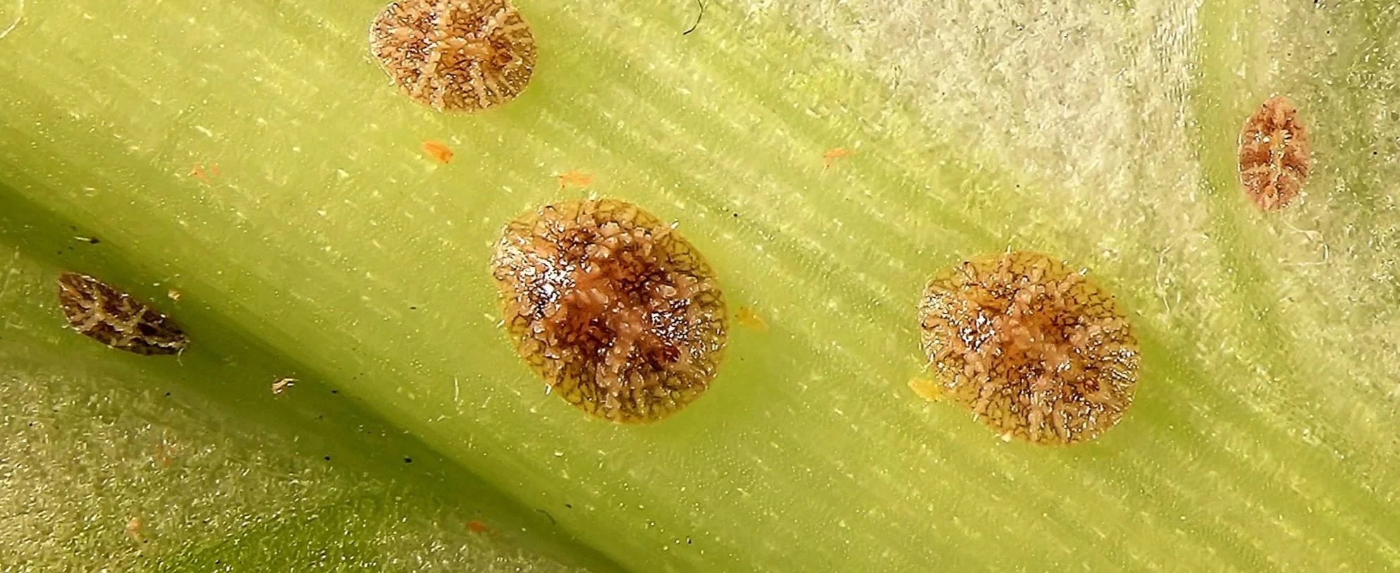 Small brown, tan, or grey bumps on stems and leaf joints that don’t move. These can be microscopic!